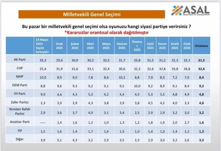 Geçen sene yüzde 29,6 oy oranına sahip AK Parti'nin Ocak 2026'da yapılan son anketteki oy oranı yüzde 32,1 olarak ölçüldü.