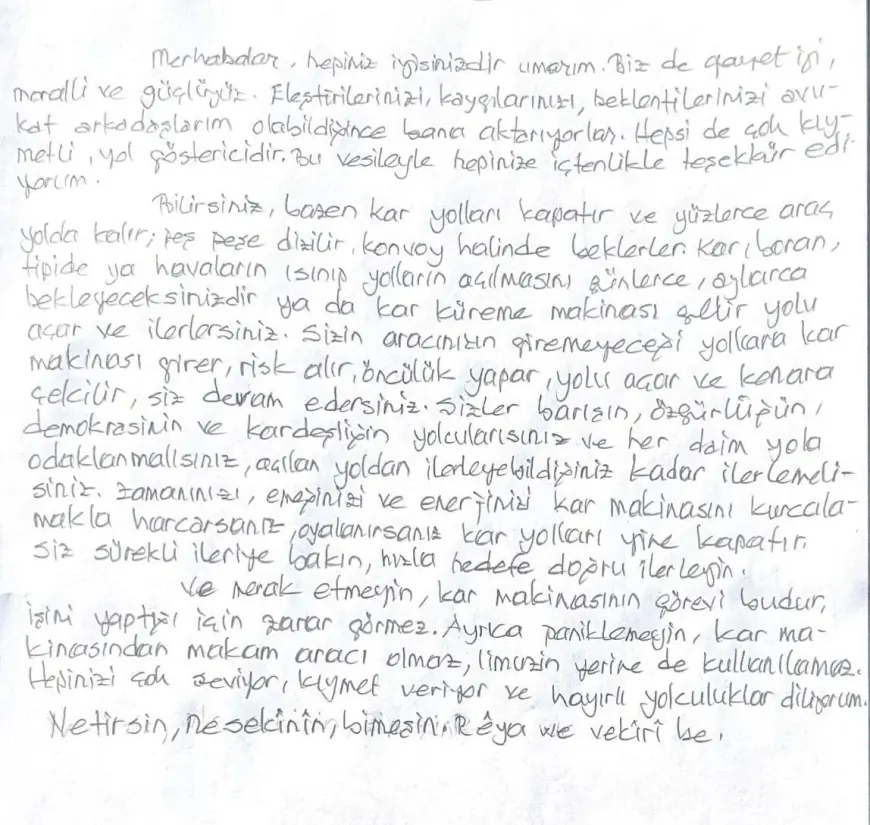 Demirtaş, mektubunda şu ifadelere yer verdi: “Bilirsiniz, bazen kar yolları kapatır ve yüzlerce araç yolda kalır; peş peşe dizilir, konvoy halinde beklerler. Kar, boran, tipide ya havaların ısınıp yolların açılmasını günlerce, aylarca bekleyeceksinizdir ya da kar küreme makinası gelir, yolu açar ve ilerlersiniz. Sizin aracınızın giremeyeceği yollara kar makinası girer, risk alır, öncülük yapar, yolu açar ve kenara çekilir; siz devam edersiniz. Sizler barışın, özgürlüğün, demokrasinin ve kardeşliğin yolcularısınız ve her daim yola odaklanmalısınız; açılan yoldan ilerleyebildiğiniz kadar ilerlemelisiniz. Zamanınızı, emeğinizi ve enerjinizi kar makinasını kurcalamakla harcarsanız, oyalanırsanız kar yolcuları yine kapatır. Siz sürekli ileriye bakın, hızla hedefe doğru ilerleyin. Ve merak etmeyin, kar makinasının görevi budur, işini yaptığı için zarar görmez. Ayrıca paniklenmeyin, kar makinasından makam aracı olmaz, limuzin yerine de kullanılamaz.