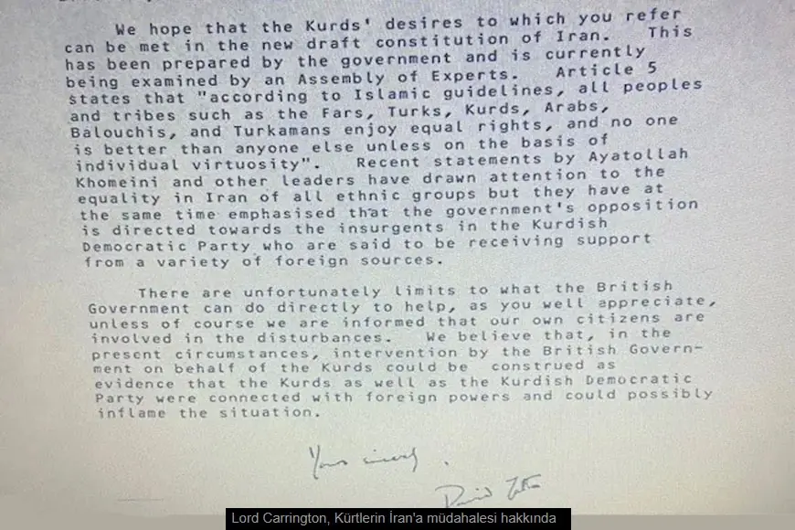 Dönemin Dışişleri Bakanı Lord Carrington adına verilen yanıtta, “İngiliz müdahalesi, Kürtlerin yabancı güçlerle iş birliği yaptığı iddialarını güçlendirebilir ve durumu daha da kötüleştirebilir” denildi.