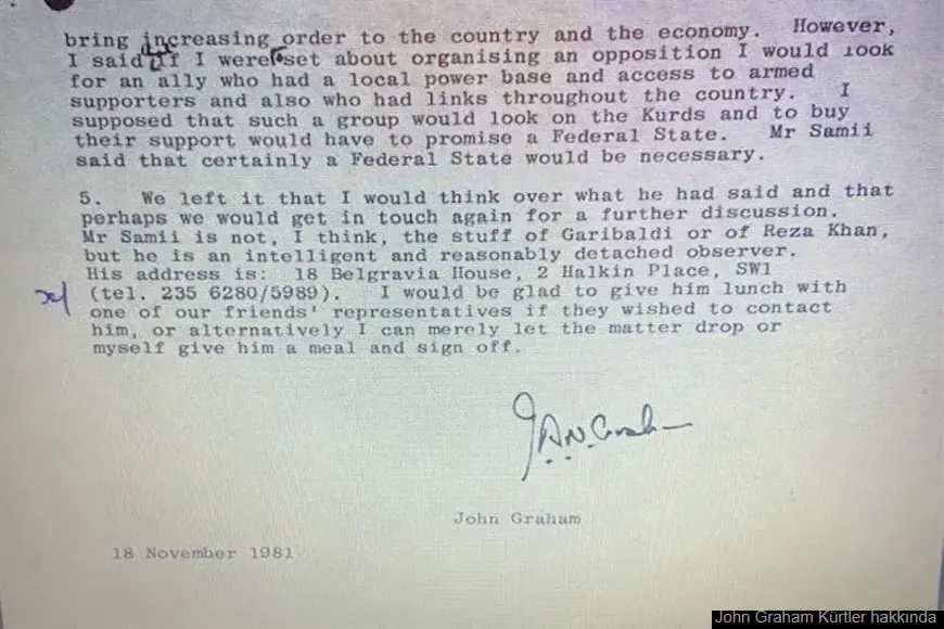 Dönemin Dışişleri Bakanlığı Müsteşar Yardımcısı John Graham, eski İran Merkez Bankası Başkanı Mehdi Samii ile yaptığı görüşmede, muhaliflerin “silahlı desteği olan ve ülke genelinde bağlantılara sahip” bir müttefik bulması gerektiğini söyleyerek, “Kürtler en olası güçtür, onları kazanmanın yolu federal devlet sözü vermektir” dedi.