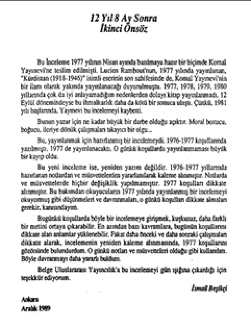 “Bu inceleme 1977 yılının Nisan ayında basılmaya hazır bir biçimde Komal Yayınevi'ne teslim edilmişti. Lucien Rambout'nun, 1977 yılında yayınlanan, "Kürdistan (1918-1946)" isimli eserinin son sahifesinde de, Komal Yayınevi'nin bir ilanı olarak yakında yayınlanacağı duyurulmuştu. 1977, 1978, 1979, 1980 yıllarında çok da iyi anlayamadığım nedenlerden dolayı kitap yayınlanmadı. Eylül dönemindeyse bu ihmalkârlık daha da kötü bir sonuca ulaştı. Çünkü, 1981 yılı başlarında, Yayınevi bu incelemeyi kaybetti.