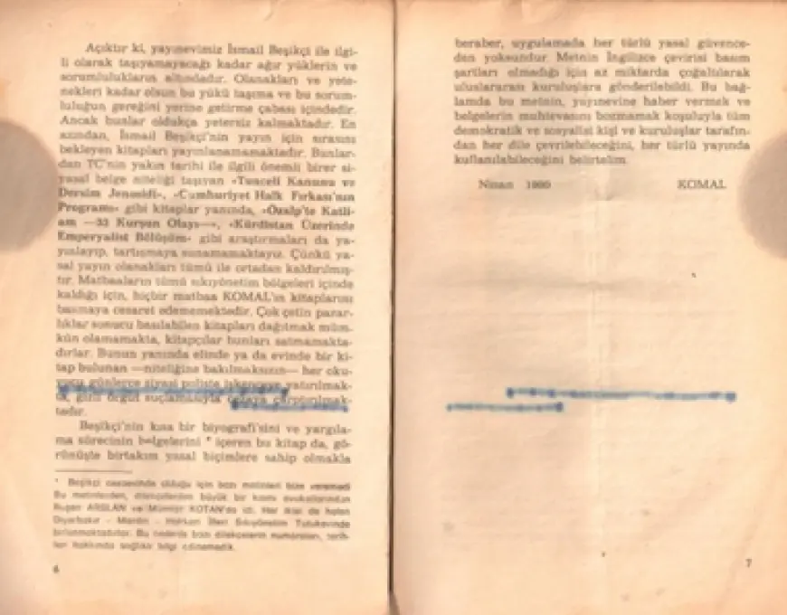 "Açıktır ki, yayınevimiz İsmail Besikçi ile ilgili olarak taşıyamayacağı kadar ağır yüklerin ve sorumlulukların altındadır. Olanakları ve yetenekleri ölçüsünde bu yükü taşıma ve bu sorumluluğun gereğini yerine getirme çabası içindedir. Ancak bunlar oldukça yetersiz kalmaktadır. En azından, İsmail Beşikçi'nin yayın için sırasını bekleyen kitapları yayınlanamamaktadır. Bunlardan TC'nin yakın tarihi ile ilgili önemli birer siyasal belge niteliği taşıyan «Tunceli Kanunu ve Dersim Jenosidi», «Cumhuriyet Halk Fırkası'nın Programı" gibi kitaplar yanında., "Özalp'te Katliam -33 Kurşun Olayı" «Kürdistan Üzerinde Emperyalist Bölüşüm" gibi araştırmaları da yayınlayıp, tartışmaya sunamamaktayız. Çünkü yasal yayın olanaklar tümü ile ortadan kaldırılmıştır. Matbaaların tümü sıkıyönetim bölgeleri içinde kaldığı için, hiçbir matbaa KOMAL'ın kitaplarını basmaya cesaret edememektedir. Çok çetin pazarlıklar sonucu basılabilen kitapları dağıtmak mümkün olamamakta, kitapçılar bunları satmamaktadırlar. Bunun yanında elinde ya da evinde bir kitap bulunan -niteliğine bakılmaksızın- her okuyucu günlerce siyasi poliste işkenceye yatırılmakta, gizli örgüt suçlamasıyla cezaya çarptırılmaktadır. (...) / Nisan 1980 – Komal”