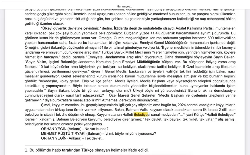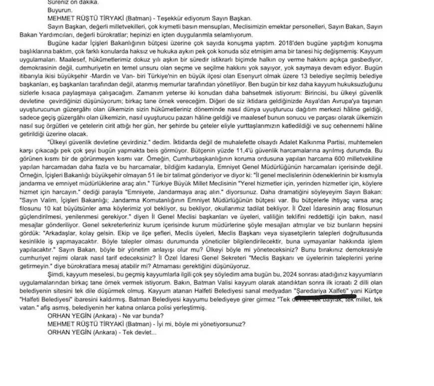 Görüşmelerde Türkiye İçişleri Bakanı Ali Yerlikaya’nın bütçe sunumunun ardından milletvekilleri söz aldı. DEM Parti milletvekilleri Dilan Kunt Ayan ile Mehmet Rüştü Tiryaki’nin konuşmalarında kullandıkları Kürtçe kelimeler ilk kez Meclis tutanaklarına yansıdı. Tiryaki, “Jin kart” ve “Şaredariya Xelfetî” (Halfeti Belediyesi) ifadelerini Kürtçe kullandı.