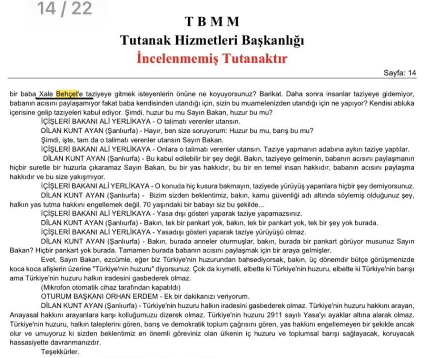 Kürtçe ifadeler yerine tırnak içinde 3 nokta işareti kullanılırken sayfa sonunda “Bu bölümde hatip tarafından Türkçe olmayan kelimeler ifade edildi” notu yer aldı.