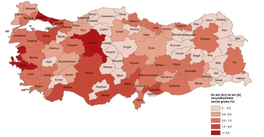 En üst ve üst seviye gruplarındaki hanelerin Türkiye içindeki dağılımı dikkat çekici: